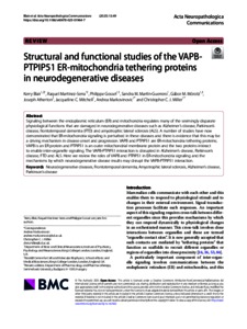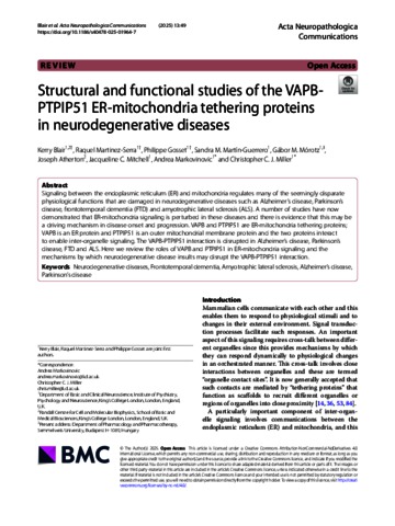 Blair, Kerry and Martinez-Serra, Raquel and Gosset, Philippe and Martín-Guerrero, Sandra M. and Mórotz, Gábor Miklós and Atherton, Joseph and Mitchell, Jacqueline C. and Markovinovic, Andrea and Miller, Christopher C. J. (2025) Structural and functional studies of the VAPB-PTPIP51 ER-mitochondria tethering proteins in neurodegenerative diseases. ACTA NEUROPATHOLOGICA COMMUNICATIONS, 13 (1). No.-49. ISSN 2051-5960