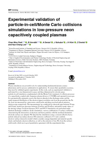 Park, Chan-Won and Horváth, Benedek and Derzsi, Aranka and Schulze, Julian and Kim, J. H. and Donkó, Zoltán and Lee, Hyo-Chang (2023) Experimental validation of particle-in-cell/Monte Carlo collisions simulations in low-pressure neon capacitively coupled plasmas. PLASMA SOURCES SCIENCE AND TECHNOLOGY, 32. p. 115003. ISSN 0963-0252 (print); 1361-6595 (online)