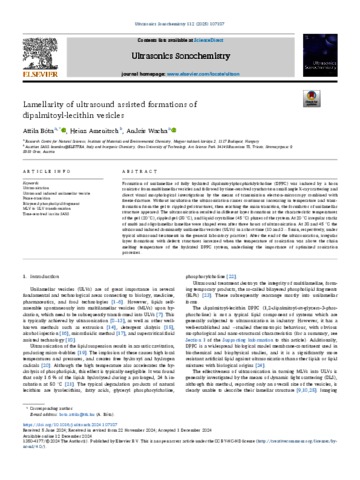 Bóta, Attila and Amenitsch, Heinz and Wacha, András Ferenc (2025) Lamellarity of ultrasound assisted formations of dipalmitoyl-lecithin vesicles. ULTRASONICS SONOCHEMISTRY, 112. No.-107187. ISSN 1350-4177