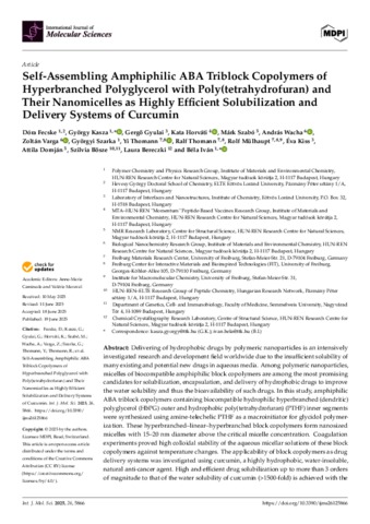 Fecske, Dóra and Kasza, György and Gyulai, Gergő and Horváti, Kata and Szabó, Márk and Wacha, András Ferenc and Varga, Zoltán and Szarka, Györgyi Éva and Thomann, Yi and Thomann, Ralf and Mülhaupt, Rolf and Kiss, Éva and Domján, Attila and Bősze, Szilvia and Nagyné Bereczki, Laura and Iván, Béla (2025) Self-Assembling Amphiphilic ABA Triblock Copolymers of Hyperbranched Polyglycerol with Poly(tetrahydrofuran) and Their Nanomicelles as Highly Efficient Solubilization and Delivery Systems of Curcumin. INTERNATIONAL JOURNAL OF MOLECULAR SCIENCES, 26 (12). No.-5866. ISSN 1661-6596
