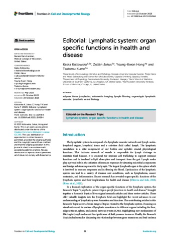 Koltowska, Kaska and Jakus, Zoltán and Hong, Young-Kwon and Kume, Tsutomu (2023) Editorial: Lymphatic system: organ specific functions in health and disease. FRONTIERS IN CELL AND DEVELOPMENTAL BIOLOGY, 11. No. 1224584. ISSN 2296-634X