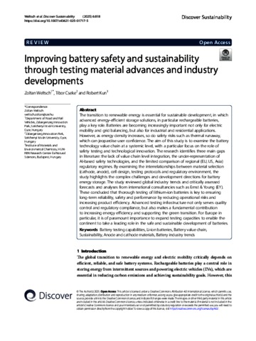 Weltsch, Zoltán and Cseke, Tibor and Kun, Robert (2025) Improving battery safety and sustainability through testing material advances and industry developments. DISCOVER SUSTAINABILITY, 6 (1). No. 818. ISSN 2662-9984