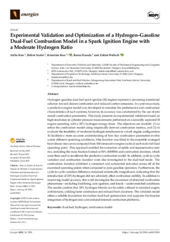 Kiss, Attila and Bálint, Szabó and Kun, Krisztián and Hanula, Barna and Weltsch, Zoltán (2025) Experimental Validation and Optimization of a Hydrogen–Gasoline Dual-Fuel Combustion Model in a Spark Ignition Engine with a Moderate Hydrogen Ratio. ENERGIES, 18 (13). No. 3501. ISSN 1996-1073