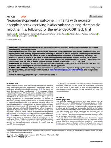 Kovács, Kata and Szakmár, Enikő and Dobi, Marianna and Varga, Zsuzsanna and Méder, Ünőke and Szabó, Attila and McNamara, Patrick J. and Szabó, Miklós and Jermendy, Ágnes (2025) Neurodevelopmental outcome in infants with neonatal encephalopathy receiving hydrocortisone during therapeutic hypothermia: follow-up of the extended-CORTISoL trial. JOURNAL OF PERINATOLOGY. ISSN 0743-8346 (In Press)