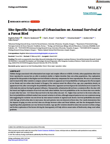 Ádámné Bukor, Boglárka and Brett, K. Sandercock and Karl, L. Evans and Pipoly, Ivett and Sándor, Krisztina and Liker, András and Seress, Gábor (2025) Site-Specific Impacts of Urbanisation on Annual Survival of a Forest Bird. ECOLOGY AND EVOLUTION, 15 (5). No. e71140. ISSN 2045-7758