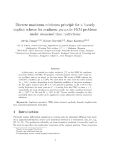 Faragó, István and Horváth, Róbert and Karátson, János (2025) Discrete maximum-minimum principle for a linearly implicit scheme for nonlinear parabolic FEM problems under weakened time restrictions. IMA JOURNAL OF NUMERICAL ANALYSIS. No. drae072. ISSN 0272-4979