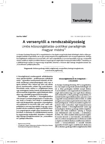 Az Európai Gazdasági Közösség 1957-es megalakulásakor a hat alapító ország között jelentős különbségek voltak az állam gazdaságban betöltött szerepét illetően, ami az egész európai integráció közszolgáltatásokhoz való viszonyát meghatározta. Jelenleg a közszolgáltatások szabályozása és szervezése több „erős” uniós szakpolitikához is szervesen kapcsolódik, és egy-egy, e szempontból releváns rendelkezés alapító szerződésbe iktatása és megszövegezése mögött súlyos kormányzati érdekek állnak. A tanulmány ezt a fejlődéstörténetet mutatja be magyarországi nézőpontból, elsősorban a közüzemi díjak hatósági ármeghatározásának (ún. „rezsicsökkentés”) példájára fókuszálva.