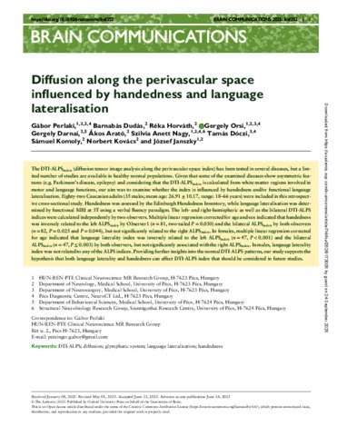 Perlaki, Gábor and Dudás, Barnabás and Horváth, Réka and Orsi, Gergely and Darnai, Gergely and Arató, Ákos and Nagy, Szilvia Anett and Dóczi, Tamás Péter and Komoly, Sámuel and Kovács, Norbert and Janszky, József Vladimir (2025) Diffusion along the perivascular space influenced by handedness and language lateralisation. BRAIN COMMUNICATIONS, 7 (4). No. fcaf252. ISSN 2632-1297