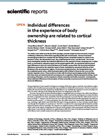 Matuz-Budai, Timea and Lábadi, Beatrix and Kohn, Eszter and Matuz, András and Zsidó, András Norbert and Inhóf, Orsolya and Kállai, János and Szolcsányi, Tibor and Perlaki, Gábor and Orsi, Gergely and Nagy, Szilvia Anett and Janszky, József Vladimir and Darnai, Gergely (2022) Individual differences in the experience of body ownership are related to cortical thickness. SCIENTIFIC REPORTS, 12. No. 808.