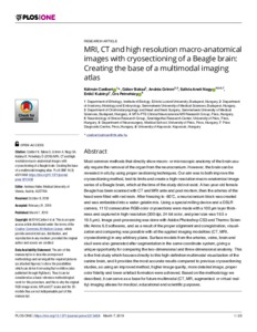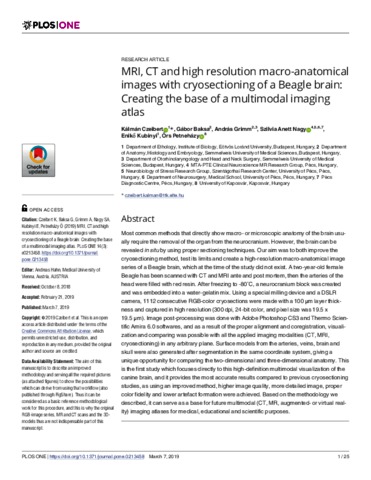 Czeibert, Kálmán and Baksa, Gábor and Grimm, András and Nagy, Szilvia Anett and Kubinyi, Enikő and Petneházy, Örs (2019) MRI, CT and high resolution macro-anatomical images with cryosectioning of a Beagle brain. Creating the base of a multimodal imaging atlas. PLOS ONE, 14 (3). No. e0213458.