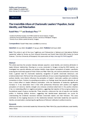 Metz, Rudolf Tamás and Plesz, Bendegúz (2025) The Irresistible Allure of Charismatic Leaders? Populism, Social Identity, and Polarisation. POLITICS AND GOVERNANCE, 13. No. 9017. ISSN 2183-2463