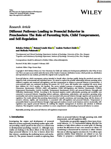 Orbán, Rebeka and Kiss, Botond László and Zsidó, András N. and Pohárnok, Melinda (2025) Different Pathways Leading to Prosocial Behavior in Preschoolers: The Role of Parenting Style, Child Temperament, and Self-Regulatio. NEW DIRECTIONS FOR CHILD AND ADOLESCENT DEVELOPMENT. No. 8836802. ISSN 1534-8687