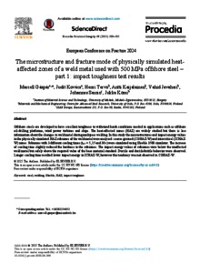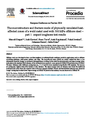 Gáspár, Marcell and Kovács, Judit and Tervo, Henri and Kaijalainen, Antti and Javaheri, Vahid and Sainio, Johannes and Kömi, Jukka (2025) The microstructure and fracture mode of physically simulated heat-affected zones of a weld metal used with 500 MPa offshore steel – part 1: impact toughness test results. PROCEDIA STRUCTURAL INTEGRITY, 68. pp. 500-505. ISSN 2452-3216