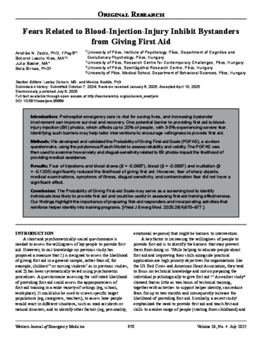 Zsidó, András N. and Kiss, Botond László and Basler, Julia and Birkás, Béla (2025) Fears Related to Blood-Injection-Injury Inhibit Bystanders from Giving First Aid. WESTERN JOURNAL OF EMERGENCY MEDICINE, 26 (4).