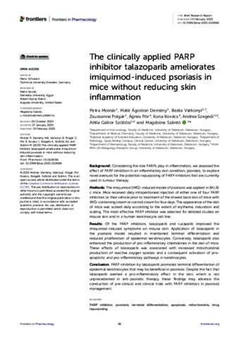 Molnár, Petra and Demény, Máté Ágoston and Várkonyi, Beáta and Polgár, Zsuzsanna and Pór, Ágnes and Kovács, Ilona and Szegedi, Andrea and Szöllősi, Attila and Szántó, Magdolna (2025) The clinically applied PARP inhibitor talazoparib ameliorates imiquimod-induced psoriasis in mice without reducing skin inflammation. FRONTIERS IN PHARMACOLOGY, 16. No. 1519066. ISSN 1663-9812