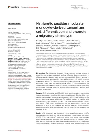 Horváth, Dorottya and Pénzes, Zsófia and Molnár, Petra and Rebenku, István and Vereb, György and Szántó, Magdolna and Muzsai, Szabolcs and Szegedi, Andrea and Dajnoki, Zsolt and Pázmándi, Kitti Linda and Fekete, Tünde and Bácsi, Attila and Szöllősi, Attila (2025) Natriuretic peptides modulate monocyte-derived Langerhans cell differentiation and promote a migratory phenotype. FRONTIERS IN IMMUNOLOGY, 16. No. 1593141. ISSN 1664-3224