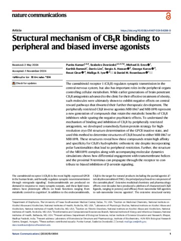 Kumari, Punita and Dvorácskó, Szabolcs and Enos, Michael D. and Ramesh, Karthik and Lim, Darrix and Hassan, Sergio A. and Kunos, George and Cinar, Resat and Iyer, Malliga R. and Rosenbaum, Daniel M. (2024) Structural mechanism of CB1R binding to peripheral and biased inverse agonists. NATURE COMMUNICATIONS, 15 (1). No.-10694. ISSN 2041-1723