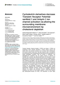 Nehr-Majoros, Andrea Kinga and Erostyák, János and Fenyvesi, Éva and Szabó-Meleg, Edina and Szőcs, Levente and Sétáló, György (ifj.) and Helyes, Zsuzsanna and Szőke, Éva (2024) Cyclodextrin derivatives decrease Transient Receptor Potential vanilloid 1 and Ankyrin 1 ion channel activation via altering the surrounding membrane microenvironment by cholesterol depletion. FRONTIERS IN CELL AND DEVELOPMENTAL BIOLOGY, 12. No. 1334130. ISSN 2296-634X