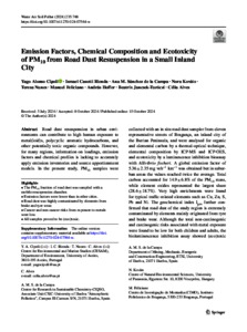 Road dust resuspension in urban environments can contribute to high human exposure to metal(loid)s, polycyclic aromatic hydrocarbons, and other potentially toxic organic compounds. However, for many regions, information on loadings, emission factors and chemical profiles is lacking to accurately apply emission inventories and source apportionment models. In the present study, PM 10 samples were collected with an in situ road dust sampler from eleven representative streets of Bragança, an inland city of the Iberian Peninsula, and were analysed for organic and elemental carbon by a thermal-optical technique, elemental composition by ICP-MS and ICP-OES, and ecotoxicity by a luminescence inhibition bioassay with Allivibrio fischeri . A global emission factor of 5.36 ± 2.35 mg veh −1 km −1 was obtained but in suburban areas the values reached twice the average. Total carbon accounted for 14.9 ± 6.8% of the PM 10 mass, while element oxides represented the largest share (28.6 ± 18.7%). Very high enrichments were found for typical traffic-related elements such as Cu, Zn, S, Pb and Ni. The geochemical index I geo further confirmed that road dust of the study region is extremely contaminated by elements mainly originated from tyre and brake wear. Although the total non-carcinogenic and carcinogenic risks associated with metal exposure were found to be low for both children and adults, the bioluminescence inhibition assay showed (eco)toxic responses for all samples, indicating that road dust resuspension may pose a significant human health and ecological threat.