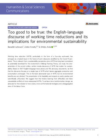 Lehmann, Benedikt and Kmetty, Zoltán and Antal, Miklós (2025) Too good to be true: the English-language discourse of working time reductions and its implications for environmental sustainability. HUMANITIES & SOCIAL SCIENCES COMMUNICATIONS, 12 (1). No. 511. ISSN 2662-9992