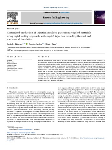 Krizsma, Szabolcs Gábor and Suplicz, András and Gere, Dániel (2025) Customised production of injection moulded parts from recycled materials using rapid tooling approach and coupled injection moulding-thermal and mechanical simulation. RESULTS IN ENGINEERING, 26. No.-105272. ISSN 2590-1230