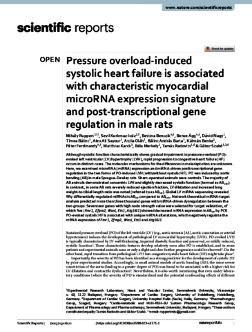 Ruppert, Mihály and Korkmaz-Icöz, Sevil and Benczik, Bettina and Ágg, Bence and Nagy, Dávid and Bálint, Tímea and Sayour, Alex Ali and Oláh, Attila and Barta, Bálint András and Benke, Kálmán and Ferdinandy, Péter and Karck, Matthias and Merkely, Béla and Radovits, Tamás and Szabó, Gábor (2023) Pressure overload-induced systolic heart failure is associated with characteristic myocardial microRNA expression signature and post-transcriptional gene regulation in male rats. SCIENTIFIC REPORTS, 13 (1). No. 16122. ISSN 2045-2322