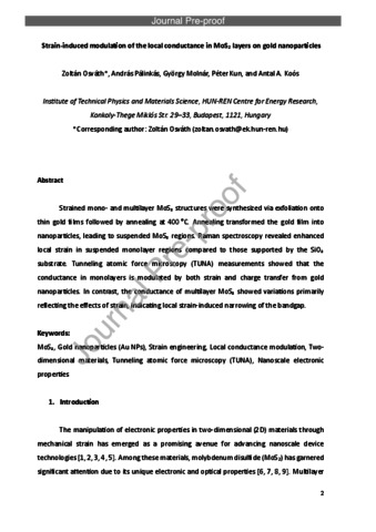 Osváth, Zoltán and Pálinkás, András and Molnár, György and Kun, Péter and Koós, Antal Adolf (2025) Strain-induced modulation of the local conductance in MoS2 layers on gold nanoparticles. SURFACES AND INTERFACES, in pre. ISSN 2468-0230 (In Press)