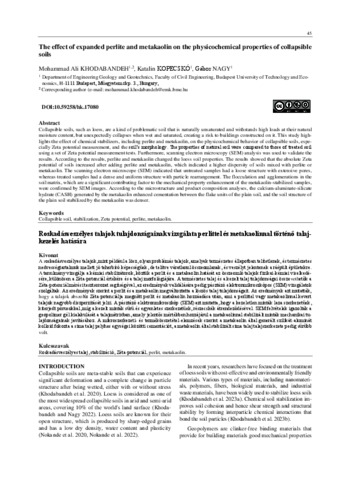 Khodabandeh, Mohammad Ali and Kopecskó, Katalin and Nagy, Gábor (2024) The effect of expanded perlite and metakaolin on the physicochemical properties of collapsible soils. HIDROLÓGIAI KÖZLÖNY, 104 (EN_1). pp. 45-52. ISSN 0018-1323