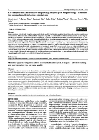 Lippai, Anett and Farkas, Rózsa and Szuróczki, Sára and Szabó, Attila and Felföldi, Tamás and Toumi, Marwene and M Tóth, Erika (2023) Két budapesti termálfürdő mikrobiológiai vizsgálata (Budapest, Magyarország) – a fürdőzés és a medenceüzemeltetés hatása a vízminőségre. HIDROLÓGIAI KÖZLÖNY, 103 (4). pp. 4-15. ISSN 0018-1323