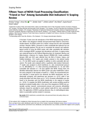 Tompa, Orsolya and Kiss, Anna and Soós, Sándor and Lakner, Zoltán and Raner, Ana and Kasza, Gyula and Szakos, Dávid (2025) Fifteen Years of NOVA Food-Processing Classification: “Friend or Foe” Among Sustainable Diet Indicators? A Scoping Review. NUTRITION REVIEWS, 83 (4). pp. 771-791. ISSN 0029-6643