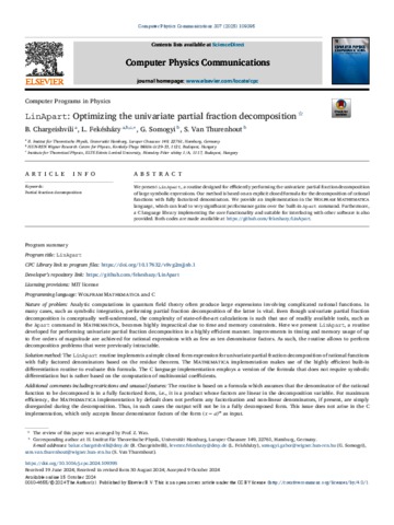 Chargeishvili, Bakar and Fekésházy, Levente and Somogyi, Gábor and Van Thurenhout, Sam (2025) LinApart: Optimizing the univariate partial fraction decomposition. COMPUTER PHYSICS COMMUNICATIONS, 307 (109395). pp. 1-14. ISSN 0010-4655 (print); 1879-2944 (online)