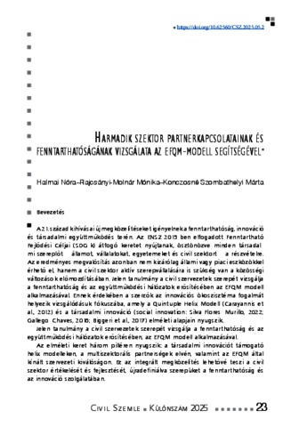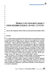 Halmai, Nóra and Rajcsányi-Molnár, Mónika and Konczosné Szombathelyi, Márta (2025) Harmadik szektor partnerkapcsolatainak és fenntarthatóságának vizsgálata az EFQM-modell segítségével. CIVIL SZEMLE, 22 (5). pp. 23-40. ISSN 1786-3341