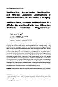 This study examines public discourses surrounding sexual harassment associated with the Hungarian #MeToo case involving theatre director László Marton, with particular attention to how neoliberal ideology—especially its emphasis on individual responsibility, market logic, and personal agency—shapes these discourses. Drawing on neoliberal victim theory and employing critical discourse analysis, the research investigates the discursive construction of sexual harassment and victimhood, as well as how the victim’s role and responsibility were framed before, during, and after the incident. The study also considers how the broader context of authoritarian neoliberalism in Hungary influences these constructions. The findings demonstrate that neoliberal rationality, female agency, and individual responsibility are central not only to anti-#MeToo victim-blaming discourse but also to the discourse supportive of the #MeToo movement. Representations of “undeserving” victimhood are closely tied to the discursive construction of identity in the failed neoliberal subject, portrayed as either displaying negative agency or lacking agency altogether. In contrast, the #MeToo discourse often seeks to explain and normalise victims’ behaviour, at times relying on arguments grounded in neoliberal logic. A third discursive strand—specifically tied to Hungary’s authoritarian context—emerges in the form of instrumentalised #MeToo rhetoric, wherein the movement’s narratives are co-opted for political purposes. | A tanulmány azt vizsgálja, hogy a neoliberális ideológia – különösen az egyéni felelősség, a cselekvőképesség és a piaci logika hangsúlyozása – hogyan formálja a szexuális zaklatással kapcsolatos nyilvános diskurzusokat a Marton László színházi rendezőhöz köthető magyarországi #MeToo-ügyben. A neoliberális áldozatelméletre építve és a kritikai diskurzuselemzés módszerét alkalmazva a kutatás a szexuális zaklatás és az áldozatiság konstrukciójára, valamint a neoliberális ideológia ebben játszott szerepére összpontosít, különös figyelmet fordítva a cselekvőképesség és felelősség kérdésére a zaklatás előtt, közben és után. Emellett azt is elemzi, hogy miként hat a magyarországi autoriter neoliberalizmus kontextusa ezekre a diskurzusokra. Az eredmények azt mutatják, hogy a neoliberális racionalitás, a női cselekvőképesség és a személyes felelősség központi szerepet játszanak mind az anti-#MeToo, mind a #MeToo diskurzusban. Az „érdemtelen áldozatiság” szoros kapcsolatban áll a bukott neoliberális ágens diszkurzív identitáskonstrukciójával, ahol az áldozat passzivitása, valamint a múlt és a jelenbéli cselekvései egyaránt problematizálódnak. Ezzel szemben a #MeToo-t támogató diskurzusok a az áldozati viselkedés megmagyarázására és normalizálására törekednek, amelyet olykor szintén neoliberális érvelésre alapoznak. Végül egy harmadik diskurzustípus is kirajzolódik, amely a #MeToo-t politikai célokra instrumentalizálja és kifejezetten a magyarországi autoriter neoliberális politikai kontextushoz köthető.