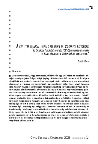 Sütő, Éva (2025) A civilitás új arcai: hibrid szerepek és közösségi biztonság : Az Országos Polgárőr Szövetség (OPSZ) erőforrás-struktúrái és állami–társadalmi relációi migrációs kontextusban. CIVIL SZEMLE, 22 (5). pp. 5-22. ISSN 1786-3341