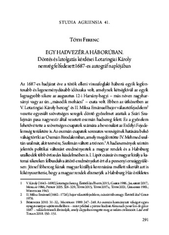 Tóth, Ferenc (2025) Egy hadvezért a háborúban : Döntés és latolgatás kérdései Lotaringiai Károly nemrég felfedezett 1687-es autográf naplójában = A General at War : Questions of Decision-Making and Deliberation in the Recently Discovered Autograph Diary of Charles V, Duke of Lorraine and Bar, from 1687. In: Végvárak, döntések és döntéshozók. Studia Agriensia (41). Dobó István Vármúzeum, Eger, pp. 291-308. ISBN 9789637223662