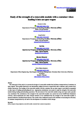Lovska, Alyona and Gerlici, Juraj and Dižo, Ján and Blatnický, Miroslav and Rukavishnykov, Pavlo (2025) Study of the strength of a removable module with a container when loading it into an open wagon. COGNITIVE SUSTAINABILITY, 4 (2). ISSN 2939-5240