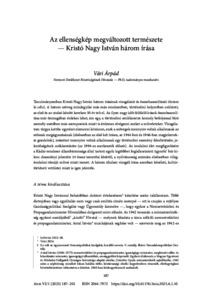 Tanulmányomban Kristó Nagy István három írásának vizsgálatát és összehasonlítását tűztem ki célul. A három szöveg mindegyike más-más rendszerben, történelmi helyzetben született, az első és az utolsó között kereken 50 év telt el. Az ilyen nagy időt felölelő írások összehasonlítása már önmagában érdekes lehet, ám egy, a történelmi emlékezetre komoly befolyással bíró személy esetében más szempontok miatt is érdemes elvégezni ezeket a műveleteket. | In this study, I analyse and compare three texts written by István Kristó Nagy, each produced under a different political regime. Kristó Nagy, who held a government position during the Second World War, published an analysis of Hungarian youth in August 1944. Two years later, he authored a work addressing the concept of “reaction,” which stands in marked contrast to his earlier publication. His final work, produced after decades of involvement with state security, published following the collapse of the communist regime. These three texts provide valuable insight into the author’s career and his relationship with the politics of each period.