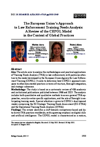Arru, Matteo and Alexa, Noémi (2025) The European Union’s Approach to Law Enforcement Training Needs Analysis: A Review of the CEPOL Model in the Context of Global Practices. BELÜGYI SZEMLE / ACADEMIC JOURNAL OF INTERNAL AFFAIRS: A BELÜGYMINISZTÉRIUM SZAKMAI TUDOMÁNYOS FOLYÓIRATA (2010-), 73 (9). pp. 1933-1949. ISSN 2062-9494