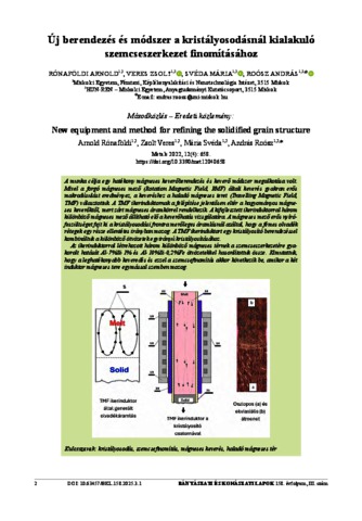 Rónaföldi, Arnold and Veres, Zsolt and Kissné Svéda, Mária and Roósz, András (2025) Új berendezés és módszer a kristályosodásnál kialakuló szemcseszerkezet finomításához. BÁNYÁSZATI ÉS KOHÁSZATI LAPOK (2023-), 158 (3). pp. 2-15. ISSN 3057-9899