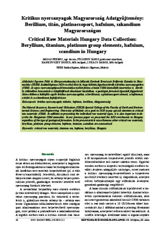 A Miskolci Egyetem Föld- és Környezettudományi és Műszaki Karának Természeti Erőforrás Kutatási és Hasznosítási (TEKH) Szakkollégiuma 2023-ra célul tűzte ki, hogy különös figyelmet fordít a kritikus nyersanyagokra (CRM). Az egyes nyersanyagtípusok bemutatása mellett fontos a hazai CRM-anomáliák ismertetése is. Korábbi cikkünkben bemutattuk a ritkaföldfémek dúsulásait hazánkban, a geológiai formáció típusától függetlenül. Jelen cikkben a különféle egyéb kritikus nyersanyagokat, a berilliumot, a platinacsoport elemeit, a hafniumot, a titánt és a szkandiumot foglaljuk össze. | The Natural Resources Research and Utilization (TEKH) Special College of the Faculty of Earth and Environmental Sciences and Engineering, University of Miskolc set a goal in 2023 to pay special attention to critical raw materials (CRM). In addition to presenting the individual raw material types, it is also important to describe the Hungarian CRM anomalies. In our previous paper we presented the REE enrichments in Hungary regardless of the type of geological formation. In the present article miscellaneous other critical raw materials, beryllium, platinum group elements, hafnium, titanium, scandium are summarized.