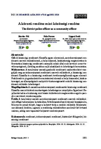 Kardos, Pál and Füle, Ferenc and Lippai, Zsolt Sándor (2025) A körzeti rendész mint közösségi rendész = The district police officer as a community officer. BELÜGYI SZEMLE / ACADEMIC JOURNAL OF INTERNAL AFFAIRS: A BELÜGYMINISZTÉRIUM SZAKMAI TUDOMÁNYOS FOLYÓIRATA (2010-), 73 (5). pp. 1001-1016. ISSN 2062-9494
