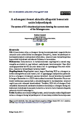 Cél: A tanulmány célja a schengeni térség kormányzásának megerősítésére irányuló uniós ambíciókkal összhangban létrejött új, közös helyzetképek és kockázatelemzések rendszerének áttekintése, valamint ezen helyzetképekhez kapcsolódó különböző indikátorok feltárása és bemutatása. Módszertan: Dokumentum- és tartalomelemzés segítségével a szerző megvizsgálta az elméleti és jogi hátteret, szabályozási körülményeket. Ezen felül szinergiapontokat tárt fel az uniós tanácsi bel- és igazságügyi fórumok működése, valamint a helyzetképek tartalma között. Megállapítások: Megállapítást nyert, hogy a Bizottság 2022-es schengeni jelentése elősegítette az uniós tanácsi, bel- és igazságügyi szakpolitikai párbeszédet és a schengeni vívmányok nyomon követését. Az ezt követően bevezetett Schengen Barométer és a 2023 márciusában bemutatott Barométer Plusz eszközök hatékonyan azonosítják a sebezhetőségeket és kockázatokat, valamint segítik az uniós válaszok koordinálását. Továbbá, 2024-től a Schengen Eredménytábla háromszintű szerkezete részletesen bemutatja a schengeni térség működésének különböző dimenzióit, beleértve a külső és belső határok állapotát, valamint a belső biztonságot is. Érték: Korábban nem készült átfogó kutatás, amely komplex módon foglalkozott volna a schengeni térség helyzetképeivel. A tanulmány elsőként bemutatja ezen helyzetképek létezését és működését, lehetővé téve a korábban nem feltárt aspektusok részletes elemzését. | Aim: The aim of the study is to review the new system of common situational pictures and risk analyses, in line with the ambitions of the EU to strengthen the governance of the Schengen area, and to explore and introduce the different indicators related to these situational pictures. Methodology: Through document and content analysis, the author examined the theoretical and legal background and regulatory context. The author also identified synergies between the functioning of the JHA forums of the Council of the EU and the content of the situation pictures. Findings: The Commission’s Schengen 2022 report was found to have facilitated the EU Council’s dialogue on justice and home affairs policy and the monitoring of the Schengen acquis. The subsequent Schengen Barometer and the Barometer Plus tools, launched in March 2023, will effectively identify vulnerabilities and risks and help coordinate the EU response. In addition, from 2024, the three-tier structure of the Schengen Scoreboard will provide details on the different dimensions of the functioning of the Schengen area, including the state of external and internal borders, as well as internal security. Value: No comprehensive research has previously been carried out that has dealt with the situational pictures of the Schengen area in a complex way. This study is the first to present the existence and functioning of these situation maps, allowing a detailed analysis of aspects not previously explored.