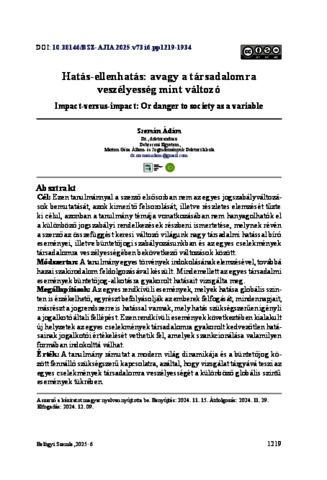 Szemán, Ádám (2025) Hatás-ellenhatás: avagy a társadalomra veszélyesség mint változó = Impact-versus-impact: Or danger to society as a variable. BELÜGYI SZEMLE / ACADEMIC JOURNAL OF INTERNAL AFFAIRS: A BELÜGYMINISZTÉRIUM SZAKMAI TUDOMÁNYOS FOLYÓIRATA (2010-), 73 (6). pp. 1219-1234. ISSN 2062-9494