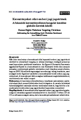 Hodge, David R. (2025) Keresztényeket célzó emberi jogi jogsértések : A fokozódó keresztényellenes hangulat kezelése globális keretek között = Human Rights Violations Targeting Christians : Addressing the Intensifying Anti-Christian Sentiment in a Global Frame. BELÜGYI SZEMLE / ACADEMIC JOURNAL OF INTERNAL AFFAIRS: A BELÜGYMINISZTÉRIUM SZAKMAI TUDOMÁNYOS FOLYÓIRATA (2010-), 73 (4). pp. 697-715. ISSN 2062-9494
