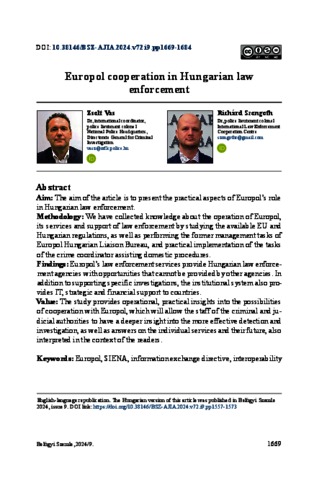 Vas, Zsolt and Szongoth, Richárd (2024) Europol cooperation in Hungarian law enforcement. BELÜGYI SZEMLE / ACADEMIC JOURNAL OF INTERNAL AFFAIRS: A BELÜGYMINISZTÉRIUM SZAKMAI TUDOMÁNYOS FOLYÓIRATA (2010-), 72 (9). pp. 1669-1684. ISSN 2062-9494