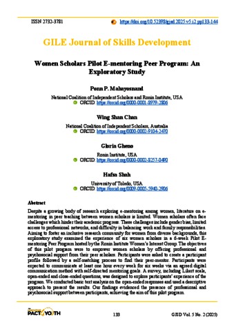 Mahayosnand, Ponn P. and Chan, Wing Shan and Gheno, Gloria and Shah, Hafsa (2025) Women Scholars Pilot E-mentoring Peer Program: An Exploratory Study. GILE JOURNAL OF SKILLS DEVELOPMENT, 5 (2). pp. 133-144. ISSN 2732-3781