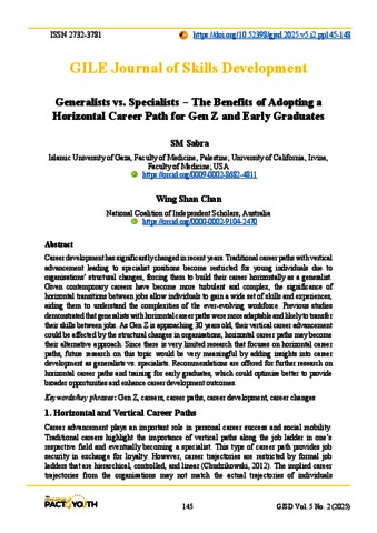 Sabra, SM and Chan, Wing Shan (2025) Generalists vs. Specialists – The Benefits of Adopting a Horizontal Career Path for Gen Z and Early Graduates. GILE JOURNAL OF SKILLS DEVELOPMENT, 5 (2). pp. 145-148. ISSN 2732-3781