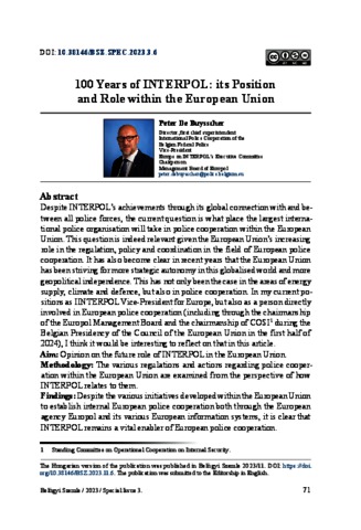 De Buysscher, Peter (2023) 100 Years of INTERPOL: its Position and Role within the European Union. BELÜGYI SZEMLE / ACADEMIC JOURNAL OF INTERNAL AFFAIRS: A BELÜGYMINISZTÉRIUM SZAKMAI TUDOMÁNYOS FOLYÓIRATA (2010-), 71 (3. kül). pp. 71-80. ISSN 2062-9494