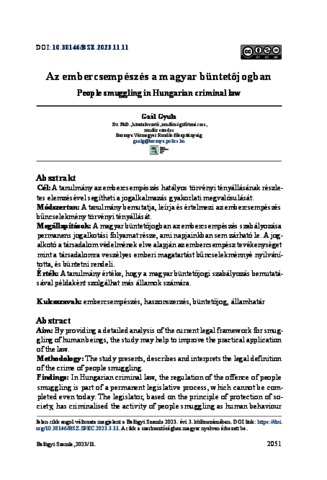 Gaál, Gyula (2023) Az embercsempészés a magyar büntetőjogban. BELÜGYI SZEMLE / ACADEMIC JOURNAL OF INTERNAL AFFAIRS: A BELÜGYMINISZTÉRIUM SZAKMAI TUDOMÁNYOS FOLYÓIRATA (2010-), 71 (11). pp. 2051-2059. ISSN 2062-9494