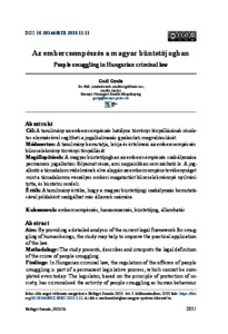 Cél: A tanulmány az embercsempészés hatályos törvényi tényállásának részletes elemzésével segítheti a jogalkalmazás gyakorlati megvalósulását.Módszertan: A tanulmány bemutatja, leírja és értelmezi az embercsempészés bűncselekmény törvényi tényállását.Megállapítások: A magyar büntetőjogban az embercsempészés szabályozása permanens jogalkotási folyamat része, ami napjainkban sem zárható le. A jogalkotó a társadalom védelmének elve alapján az embercsempész tevékenységet mint a társadalomra veszélyes emberi magatartást bűncselekménnyé nyilvánította, és büntetni rendeli.Érték: A tanulmány értéke, hogy a magyar büntetőjogi szabályozás bemutatásával példaként szolgálhat más államok számára.